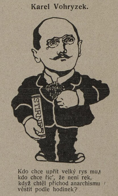 ...Vohryzek maže si sporý věnec vlasů brilantinou, chodí po Praze v šatech nejelegantnějšího střihu jako arbiter elegantiarum, kupuje si voňavky a vydává Chuďasa, anarchistický krejcarák českého lidu,.... |